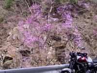 この周辺桜が咲いていたのですが、山肌にピンク色の花をつけた木が目立っていました。なんだろと思って写真を撮りましたが、詳しくないのでわかりません。こんな感じ: