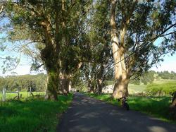 写真はいつも走っているStage Roadという道にある牧場の入り口で、ここは巨大なユーカリの木を通って行くところ。このユーカリの木はオーストラリアでコアラが食っているものと同じか分からないけど独特の匂いがあって、あちこちに群生しているのでよく見かける。こいつらは本当に大きくて最初はビックリしたけど最近は慣れちゃったなあ。