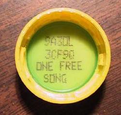 例のペプシを買って3本に1本当たるというヤツが出るとキャップの裏にこんな感じにプリントされてるんだよね。ここに書いてある10桁のコードをiTunes Music Storeの画面に入れると"1 song"って非表示されて曲がダウンロードできるようになるという仕組みなんだね。