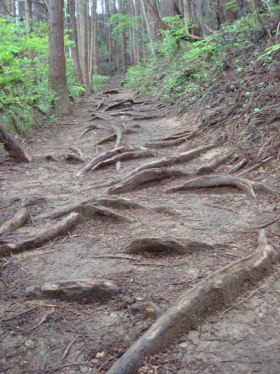 しかし写真の木の根っこがあちこちに伸びている道は歩きにくそうですね。