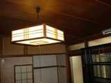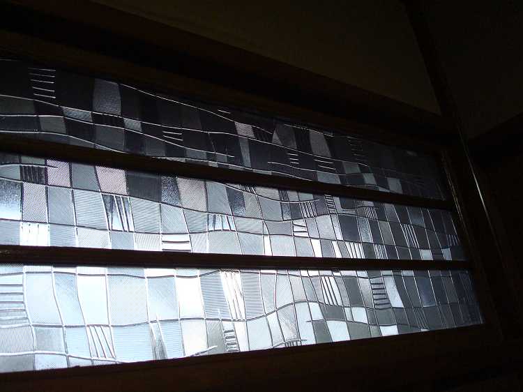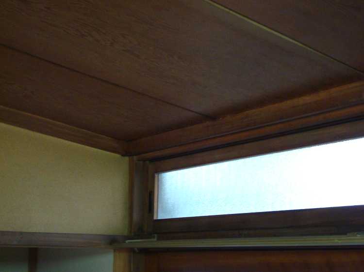 建て増しした関係でやや右下がり(南下がり)な天井。欄間のガラスも素敵。