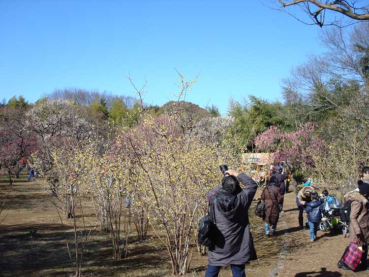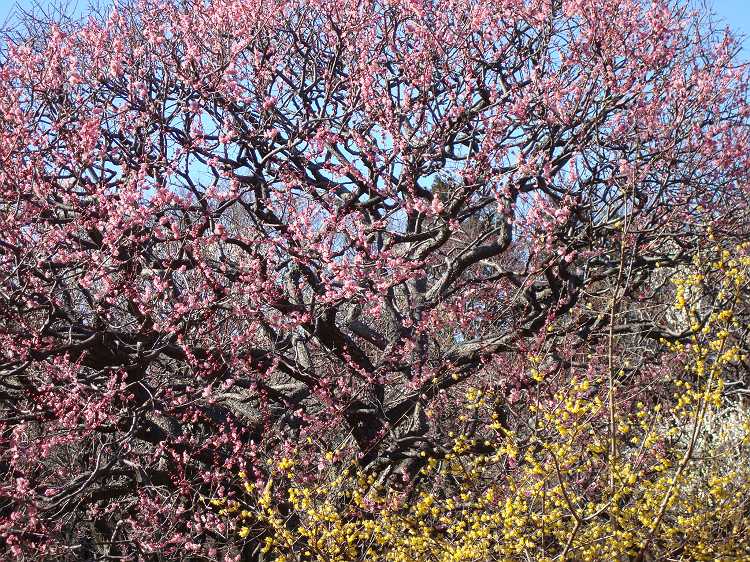 かなり久しぶりです、ここ。園内、人はそれほど多くないけれど、梅のまわりにはやはりそれなりの人。初めてここの梅林に来ましたが、結構大きな木もあり、なかなかりっぱ。ちょっと早かったですが、七分程度咲いているものもあり。青空に映えておりました。
