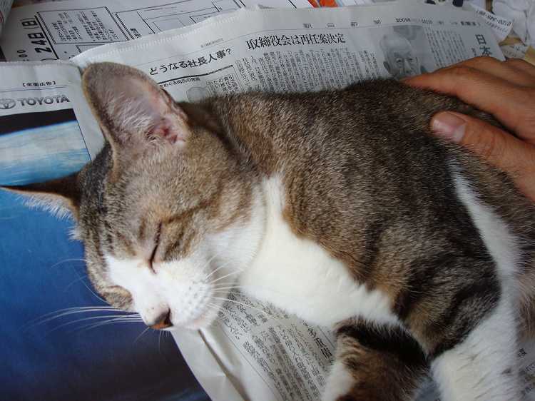 よんでいた新聞にのってきてそのまま眠ってしまうふう。