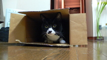 週末に備えて買い込んだワインが入っていた箱に入ってご満悦なイッチさん. 箱があればいいのか?
