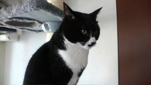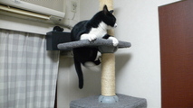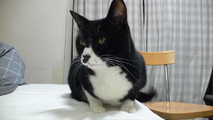 今キャットタワーから飛び降りたイッチさんですが,普段ならベッドに直接飛び降りるところいすに飛び降りたため インパクトが強く"にゃ"って言ってました.