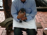 そのあとはお待ちかねのペンギンですね,膝に乗るための板とタオルと敷いて"両手で軽く支えるようにしてくださいね"というアドバイスによって支えてやると意外とちゃんと前を向いて立ってくれるんですね.ちなみにさわり心地はおもったよりべたっとしてます.撮影の後に"この子はおとなしくて良い子ですね"と係員に言うと"この子は優等生ですから"との返事で"なるほど3号はそうじゃなかったって事か・・・"と妙に納得しました.(ちなみに写真の右人差し指の絆創膏は3号に噛まれた痕)
