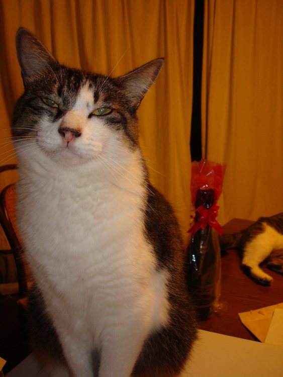 ↓うちのねこ写真みたいですが、よく見ると、背景に、お客様Dulcyさんからいただいたスペインの発泡酒カヴァが(自宅で賞味させていただく。美味でした!)